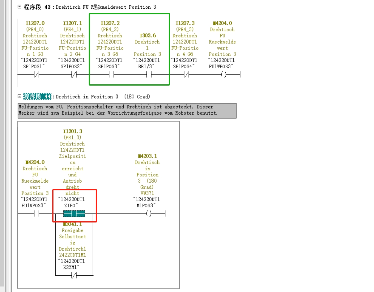 这台变频器驱动转台架,有4个位置,存放4个抓手夹具供机器人柔性切换抓手使用。故障现象机器人不去切换抓手,HMI上转台架对应的位置信号报错。 查看程序,i1207.2(变频器状态字位置3)、i303.6(位置3 接近开关) 都有信号,i1201.3 丢失导致 最终3号位M4204.0 条件不满足。确认实际位置正常后短接该信号完成机器人对接后,手动操作去3号位,i1201.3信号就有了。