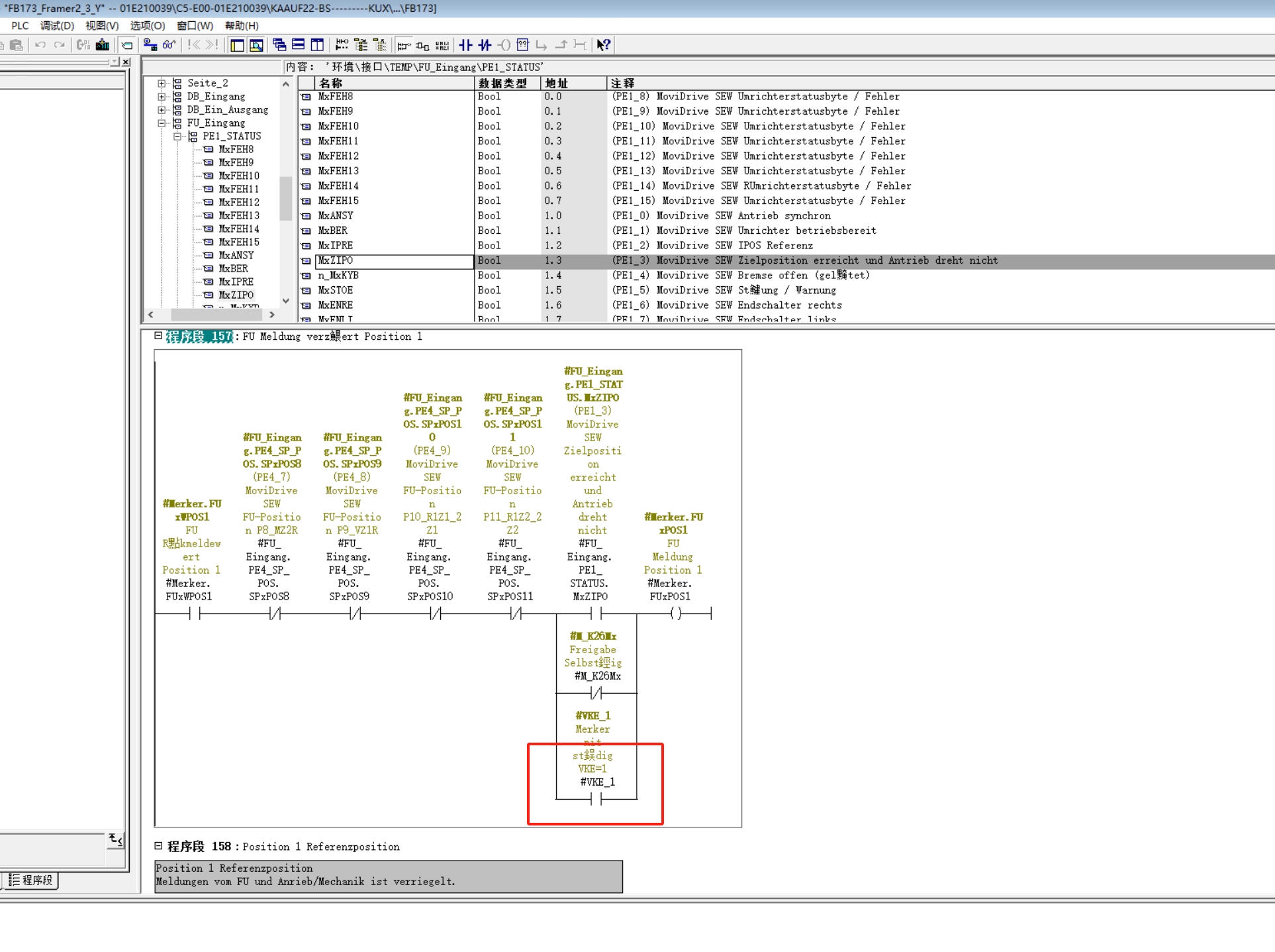 故障处理的流程很简单,当时不明白这个i1201.3是什么?故障再次出现后发现 变频器发生总线故障断网时 这个i1201.3(PE1_3)会丢失。既然位置、和接近开关信号都正常,分析i1201.3(PE1_3)程序中是否可以短接。